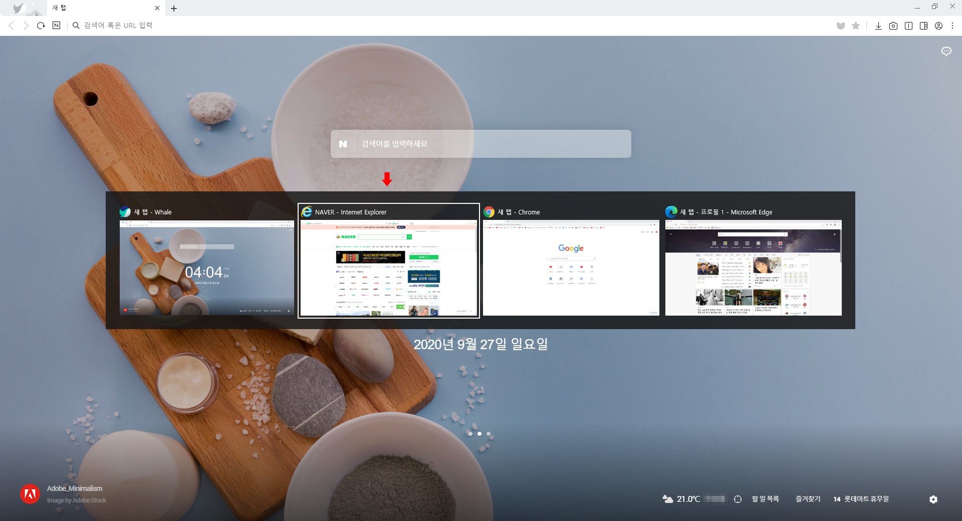 아래에 보면 인터넷 창이 4개가 있습니다. 작업 창을 쉽게 전환할 때 단축키는 alt + tab을 누르면 아래 화면 처럼 나타납니다.