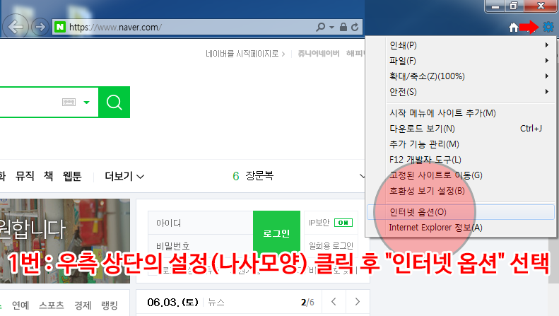 1번 : 우측 상단의 설정(나사모양) 클릭 후 "인터넷 옵션" 선택