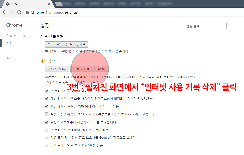 3번 : 펼쳐진 화면에서 “인터넷 사용 기록 삭제” 클릭
