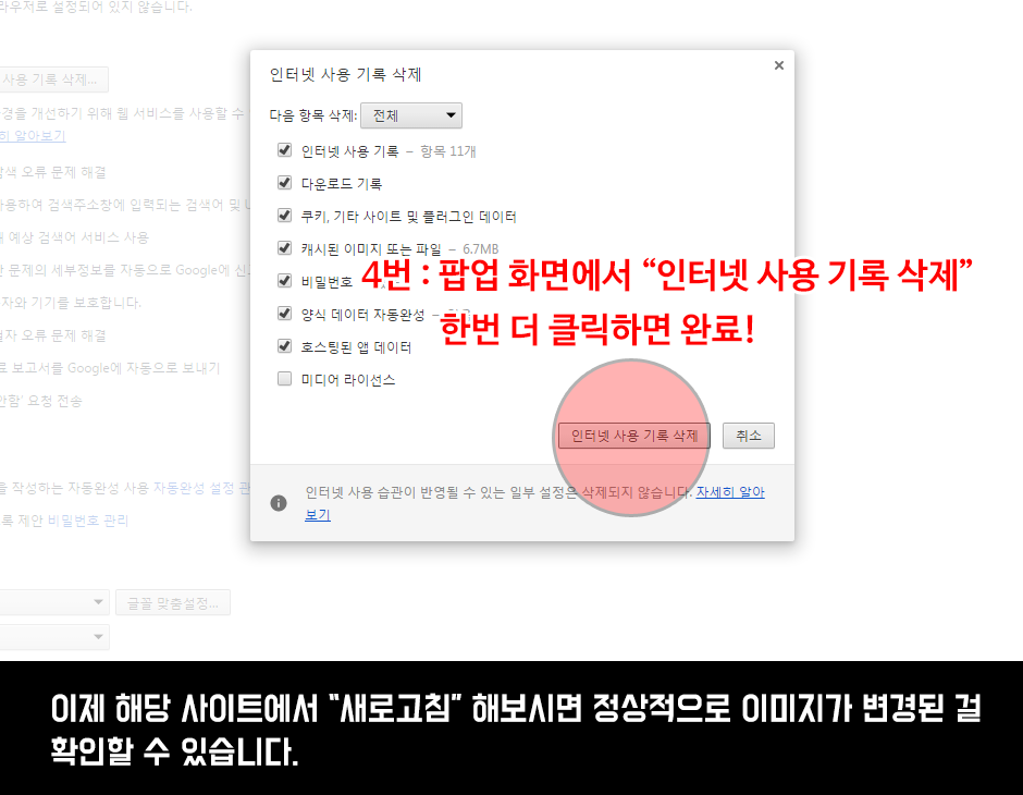4번 : 팝업 화면에서 “인터넷 사용 기록 삭제” 한번 더 클릭하면 완료!