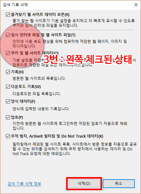 3번 : '임시 인터넷 파일 및 웹 사이트 파일(T)' 체크 & 쿠키 및 웹 사이트 데이터 등등