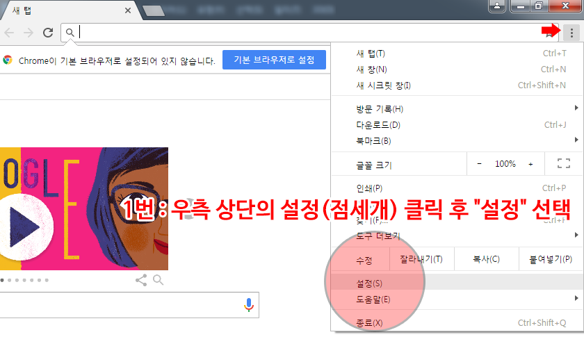 1번 : 우측 상단의 설정(점세개) 클릭 후 "설정" 선택