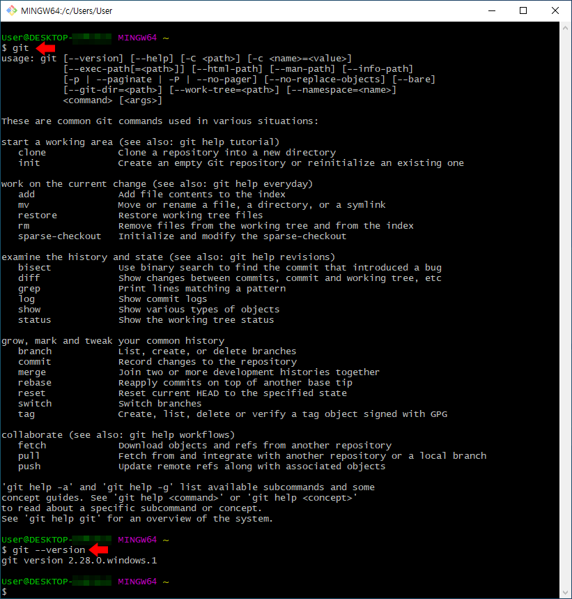 커맨드 창이 열리면 git 을 쳐 봐서 아래와 같은 명령어들이 보이면 정상 설치된 상태입니다.