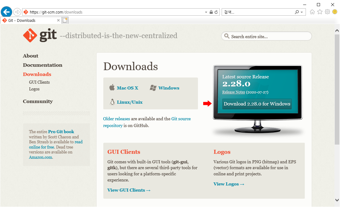 깃 공식 사이트에서 자신의 OS에 맞는 설치 파일을 다운로드합니다.