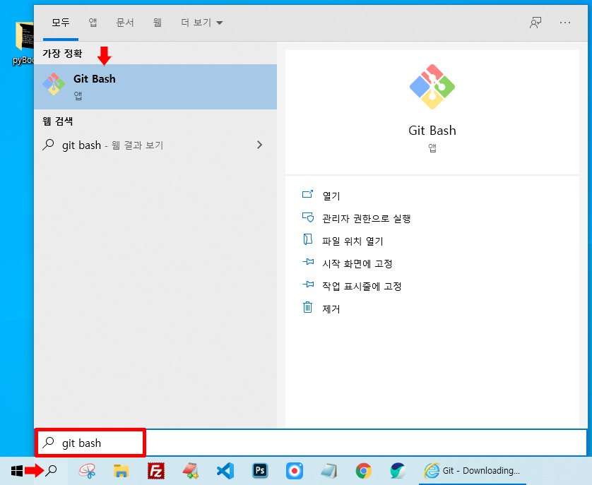 윈도우 아이콘 옆에 돋보기를 클릭 후 'git bash' 를 검색해서 해당 앱을 실행합니다.