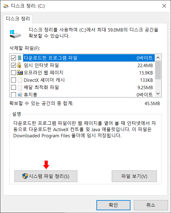 '시스템 파일 정리' 클릭