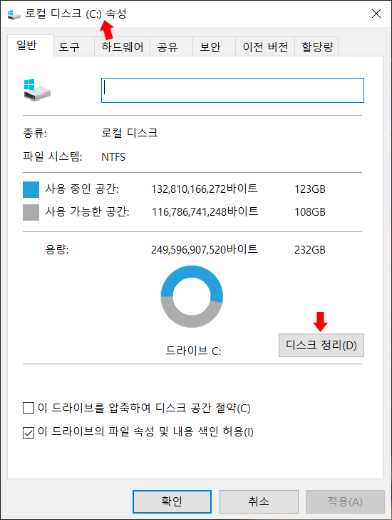 로컬 디스트 (C:) 속성 창이 뜨면 > '디스크 정리' 클릭
