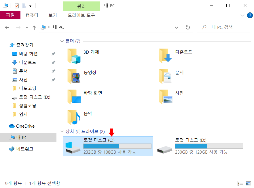 불필요한 폴더가 삭제되어, C폴더의 용량이 늘어난 것을 확인할 수 있습니다^^