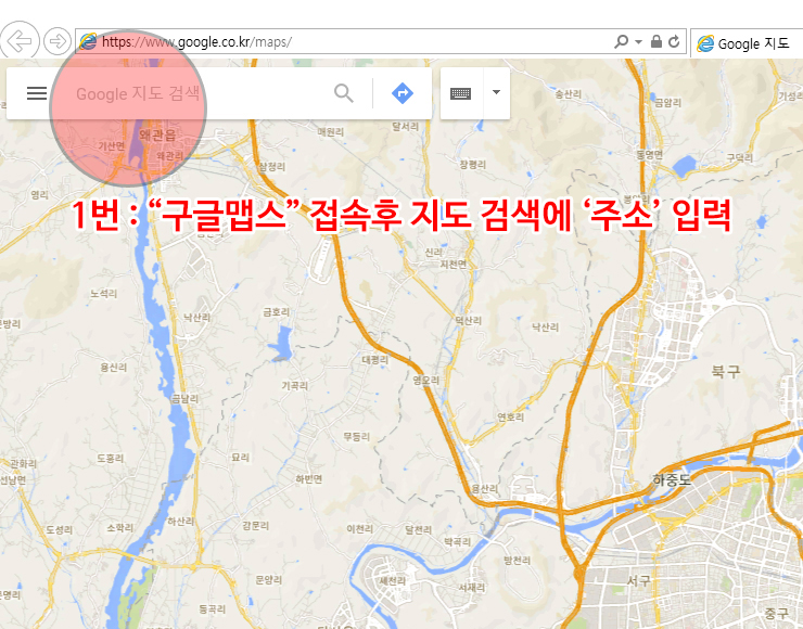 1번 : "구글맵스" 접속 후 Google 지도 검색 칸에 자신이 검색할 "주소" 를 입력하면 됩니다.