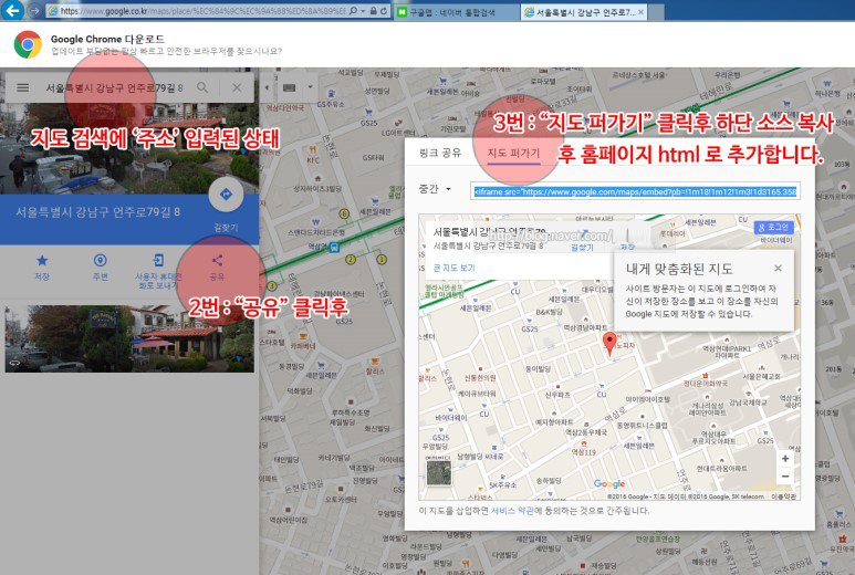 3번 : 상단 탭에 "지도 퍼가기" 클릭 후 <iframe~ 으로 시작되는 html 소스를 복사해서 홈페이지 등에 html 로 추가하면 됩니다.