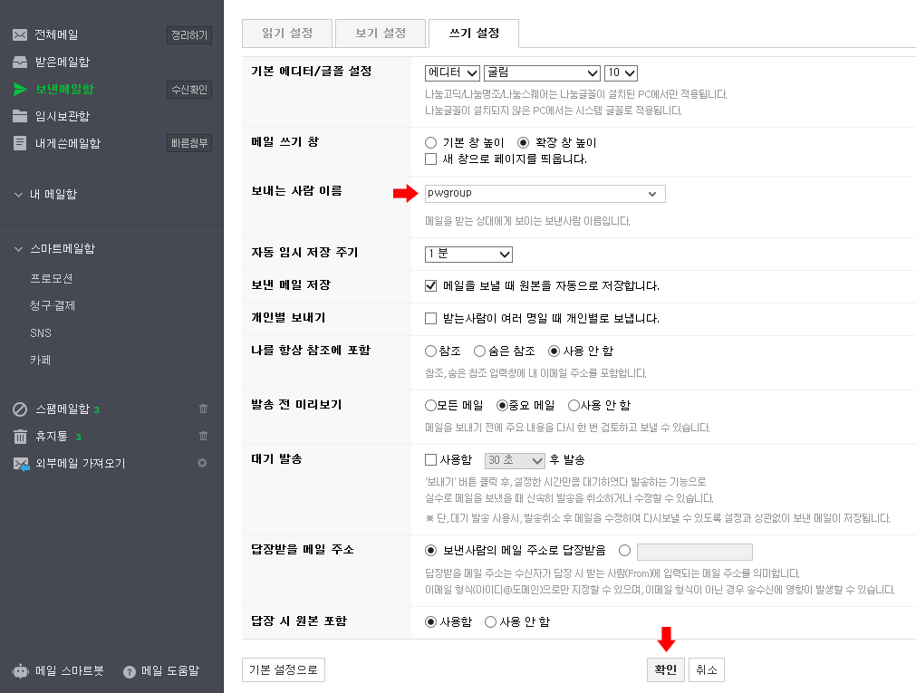 메일을 보낼 때 기본 설정된 이름에서 다른 이름으로... 보내는 사람 이름을 변경해보겠습니다.