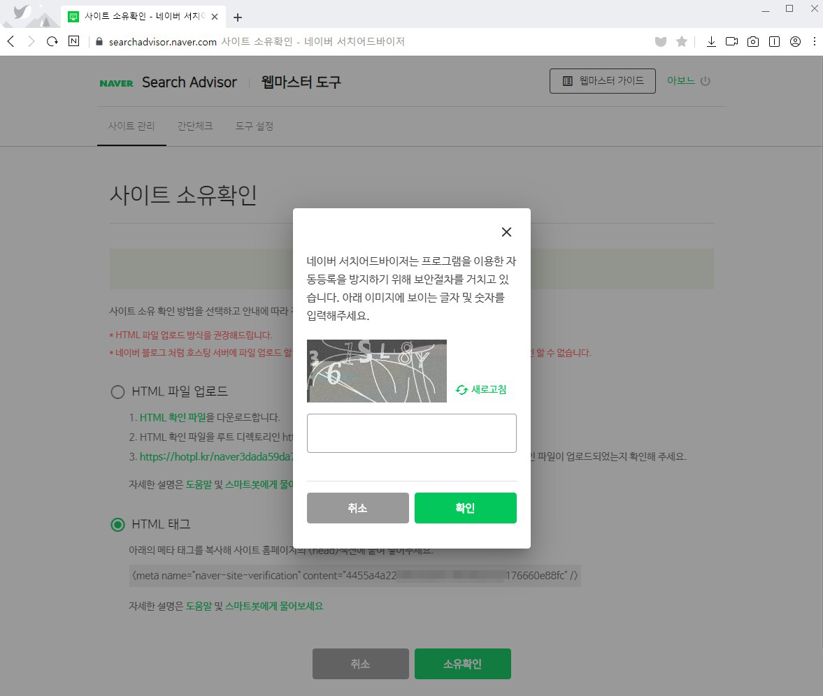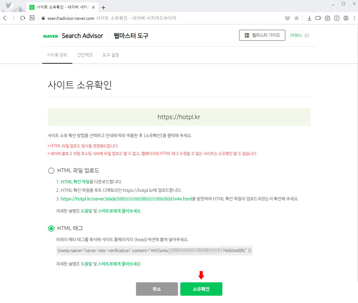 사이트 소유확인을 위한 방법 중 'HTML 태그' 를 체크 후