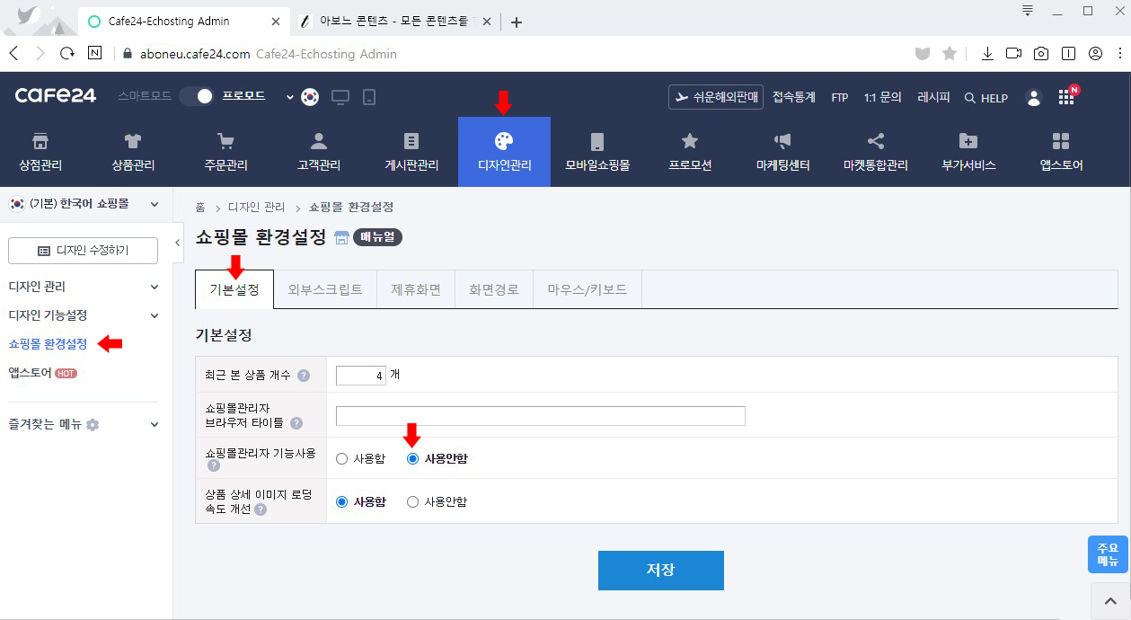 관리자 페이지 > 상단 '디자인관리' > 좌측 '쇼핑몰 환경설정' > 가운데 '기본설정' 탭 클릭 후