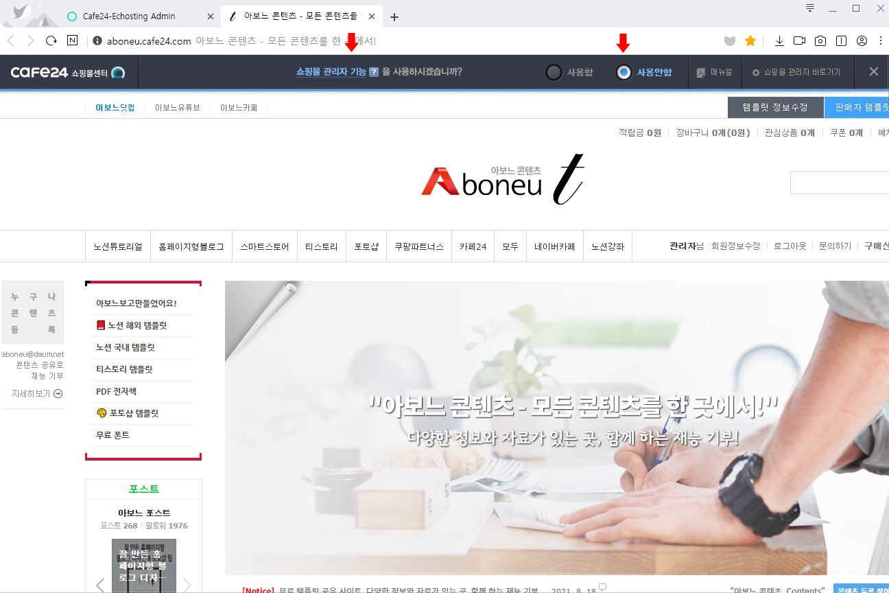 쇼핑몰관리자 기능 사용에서 '사용안함' 체크 후 저장