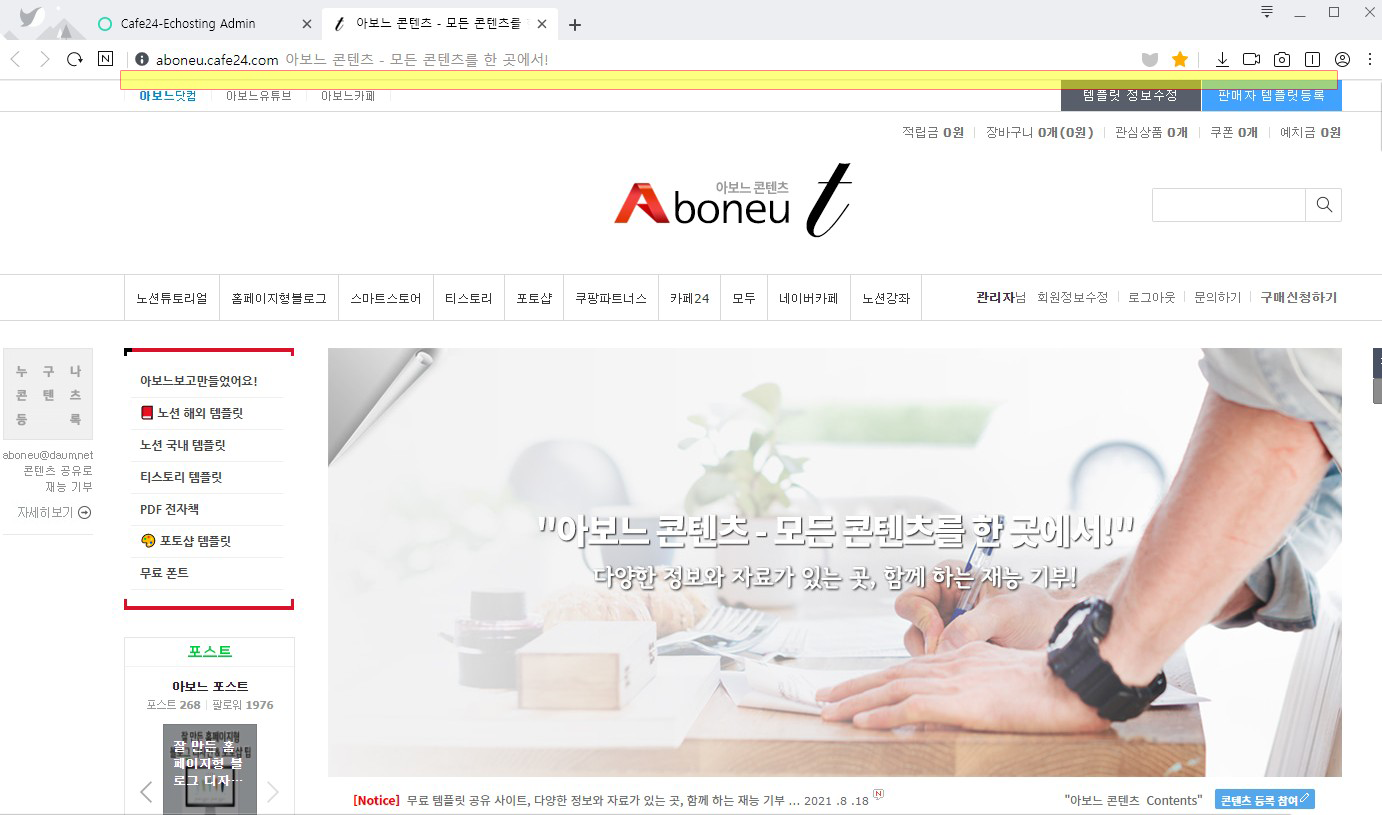 쇼핑몰 관리자 페이지로 접속하면 상단 부분에 '쇼핑몰 관리자 기능' 팝업이 항상 투명하게 나타난다.