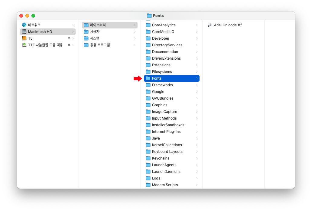 Fonts 경로로 'TTF 나눔글꼴 모음 맥용' 파일들을 전체 선택 > 드래그 후 오른쪽 Fonts 폴더 안으로 이동하기!