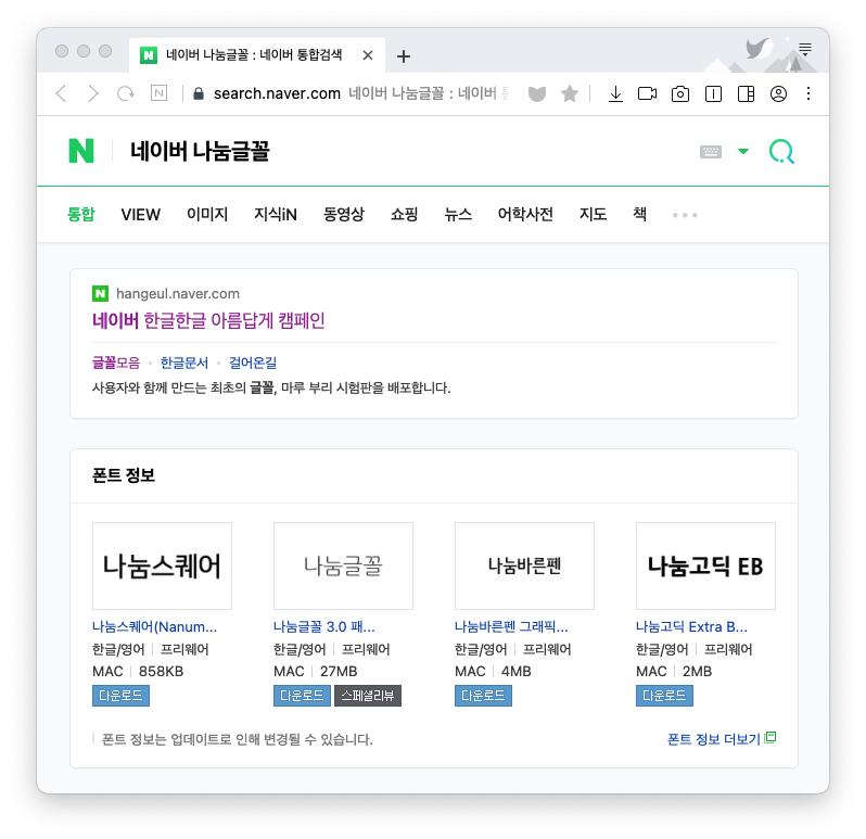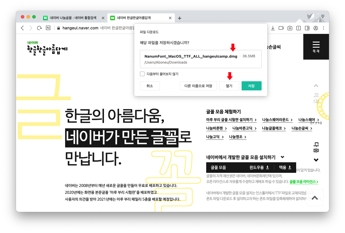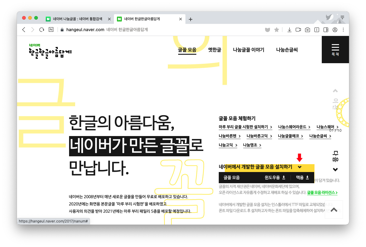 가운데에 '네이버에서 개발한 글꼴 모음 설치하기' 화살표 클릭 > 맥용 > 다운로드 클릭