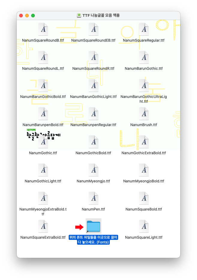 NanumFont_MacOS_TTF_ALL_hangeulcamp.dmg 파일을 다운받아 실행합니다.