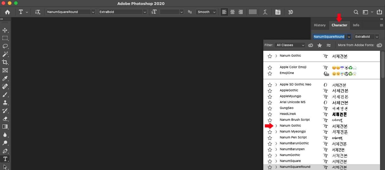 이제, 포토샵 등을 열어서 폰트가 잘 설치되었는지 확인하면 제대로 설치가 된 것을 볼 수 있습니다^^