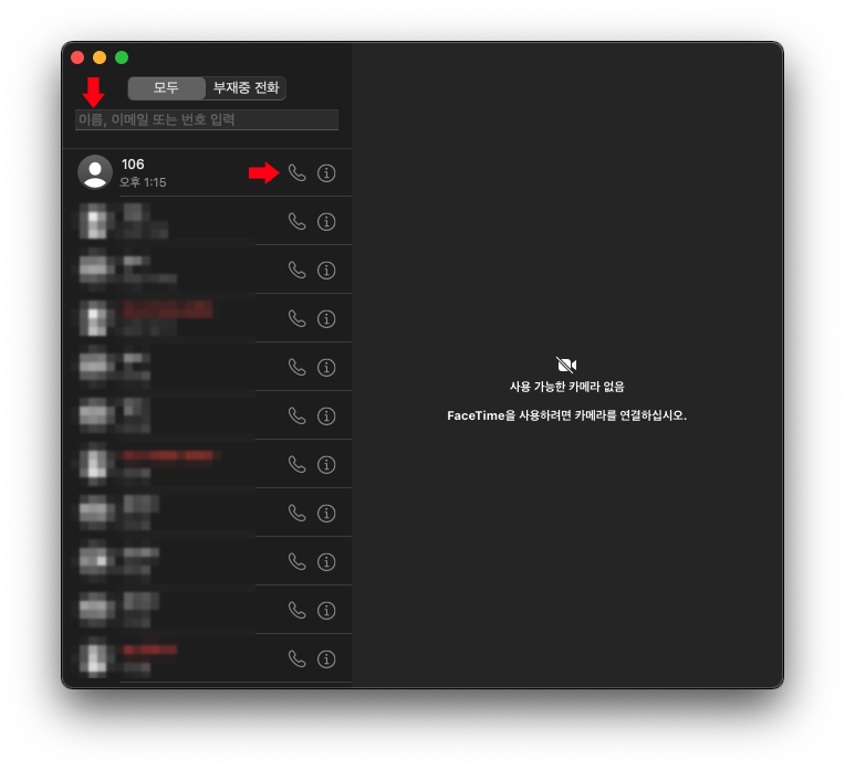 맥 기기에서 페이스타임 실행 후 전화 걸 번호를 입력 후 통화 버튼을 클릭합니다.