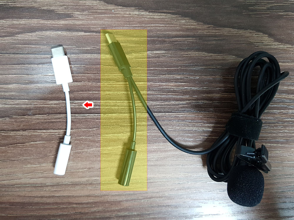 아이패드 C단자에 위 다이소 마이크를 연결하고 노란색 부분에 이어폰을 끼웠습니다.