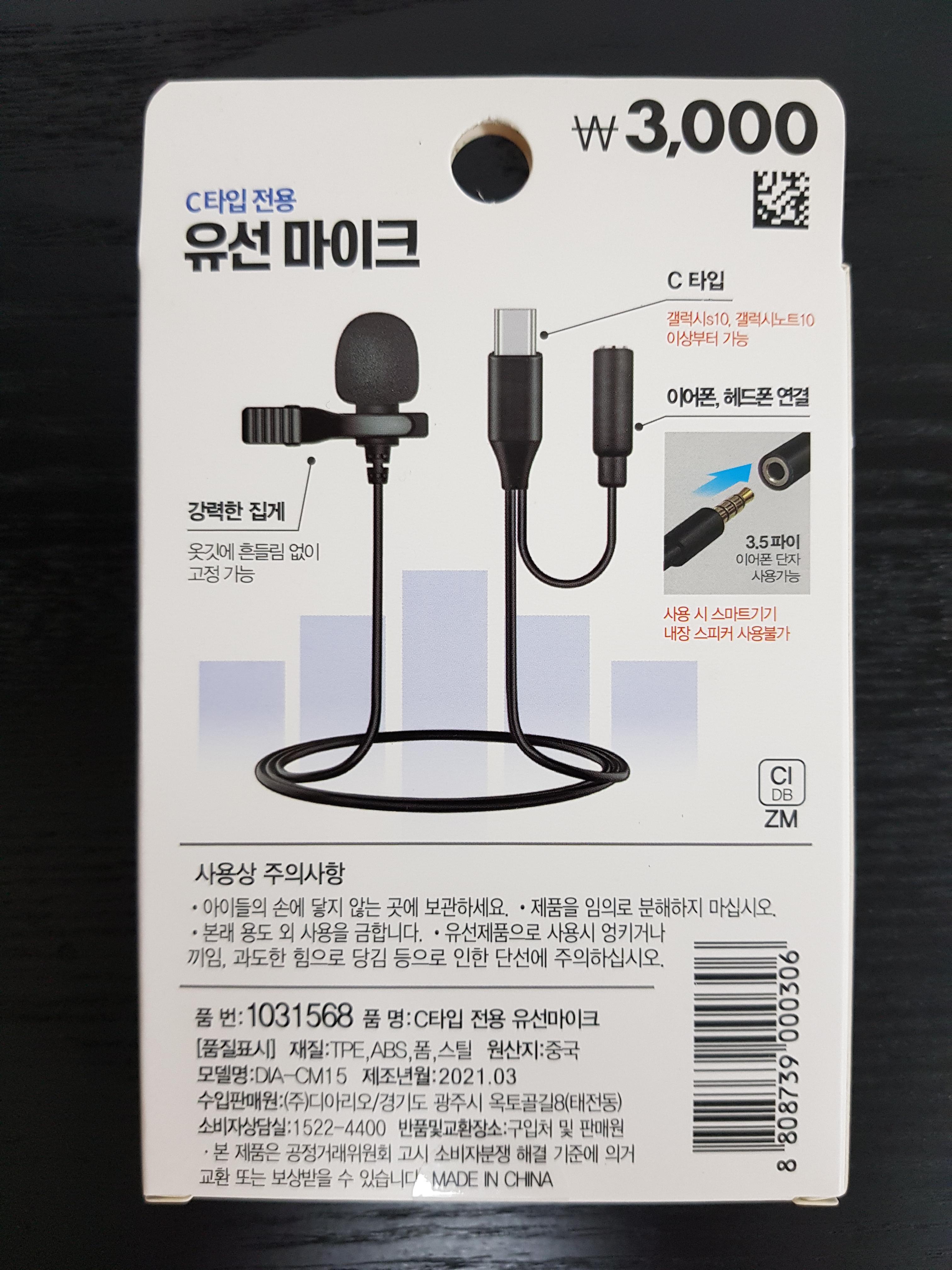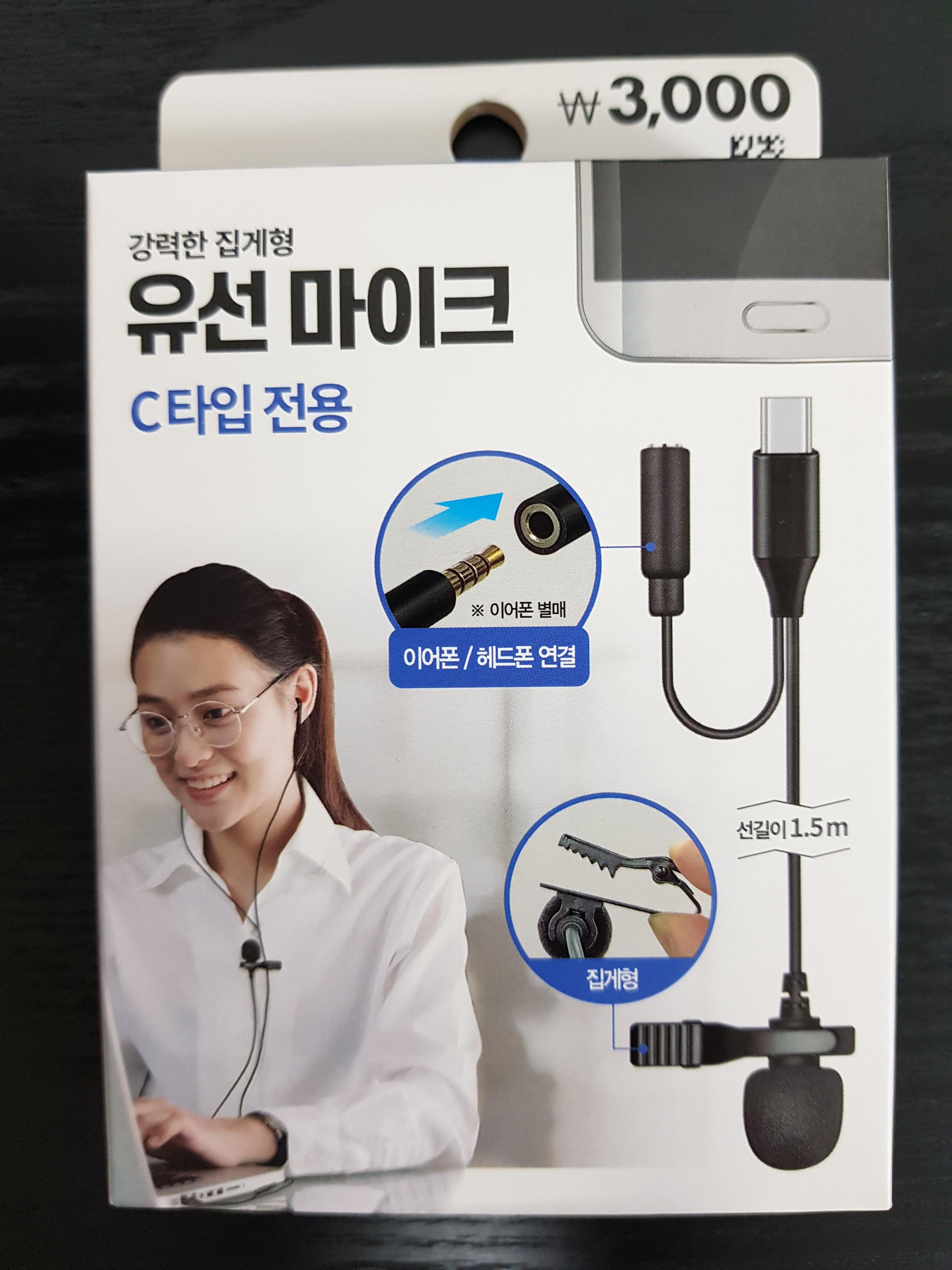 다이소에서 파는 두 번째 마이크 - C타입으로 연결되는 선 길이 1.5m 핀 마이크입니다.