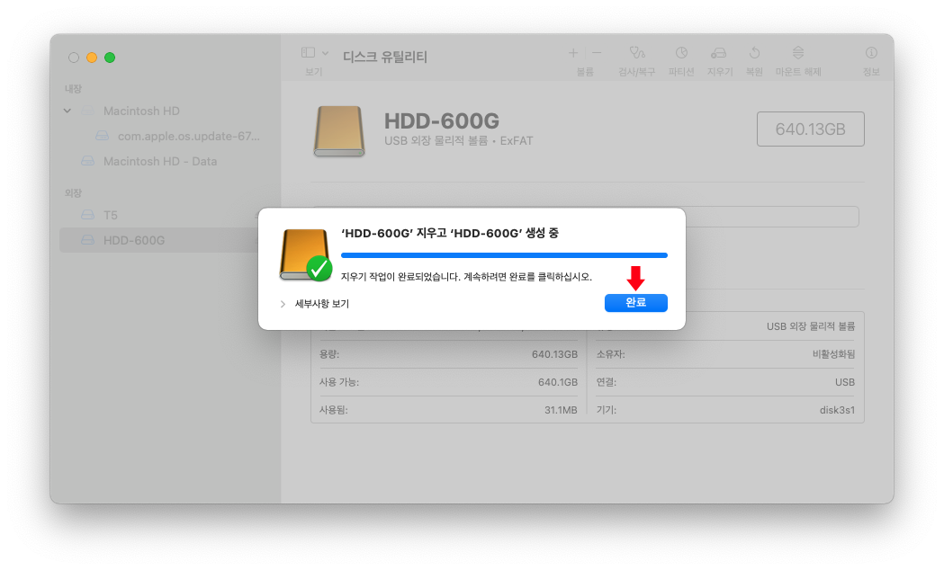 지우기 작업이 완료되었습니다. > 완료 클릭