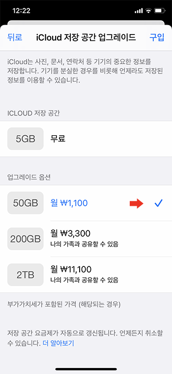저는 업그레이드 옵션으로 50GB - 월 1,100원으로 선택하였습니다.