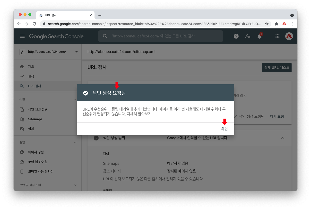 이렇게 색인 생성 요청됨니다. > 확인 클릭