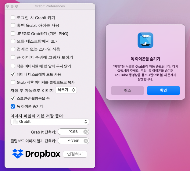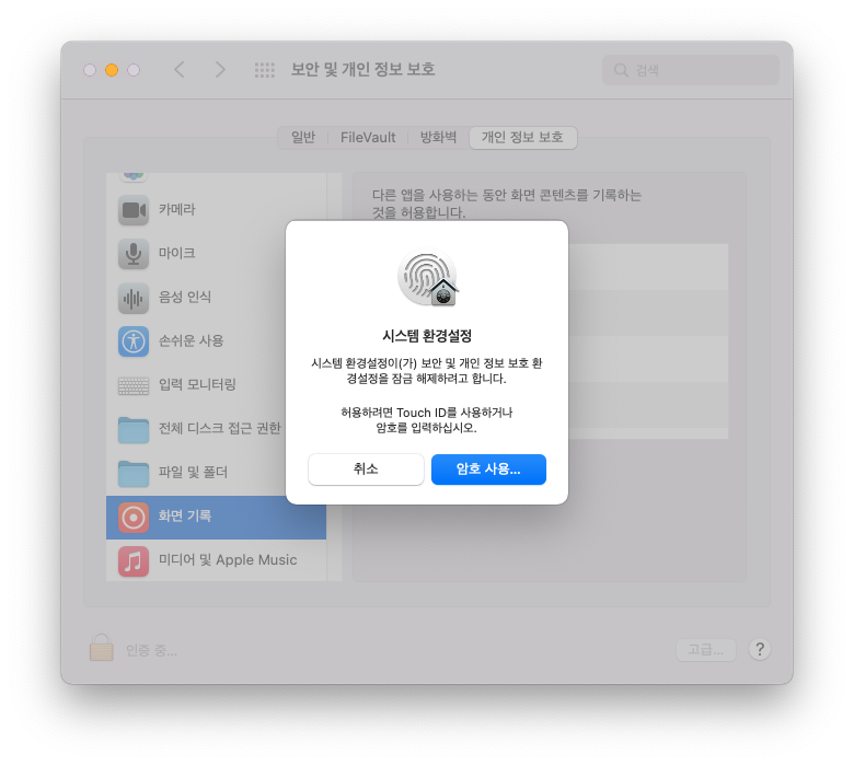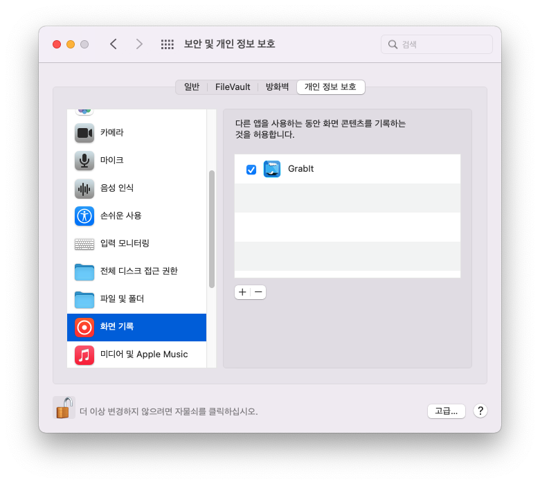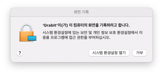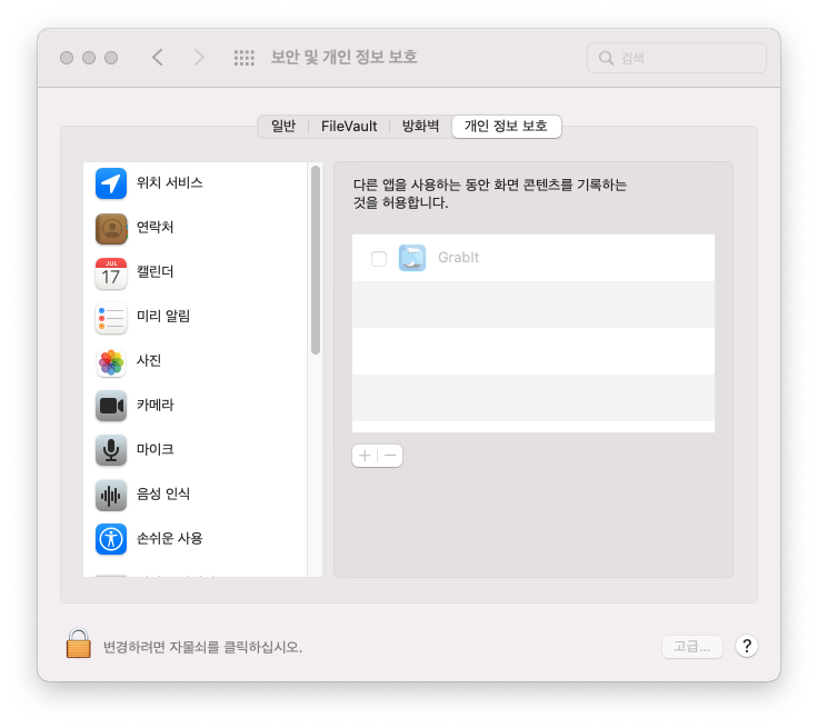 아래 권한 설정을 허용 안 하면 Grabit으로 캡처 시 바탕화면만 찍힌다.