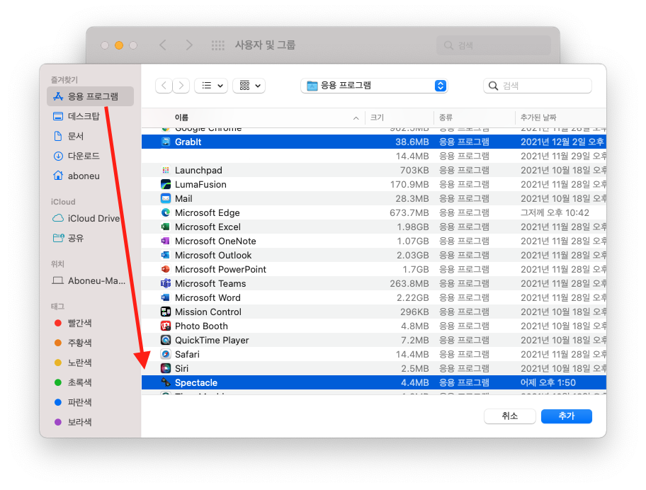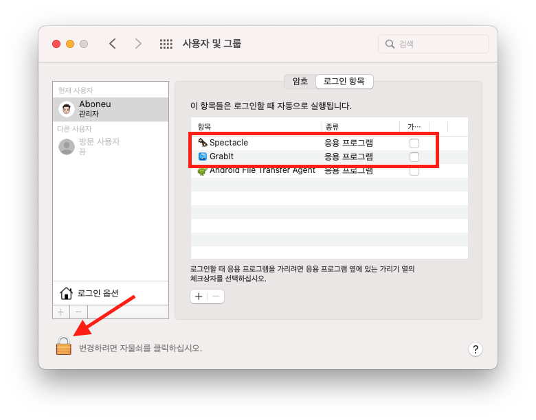 "맥OS 기기에서 컴퓨터를 부팅 시 자동으로 실행되었으면 하는 앱들이 있습니다. 예를 들어 저는 grapit이라는 앱과 spectacle이라는 2개의 앱을 자동 실행되도록 해보겠습니다."