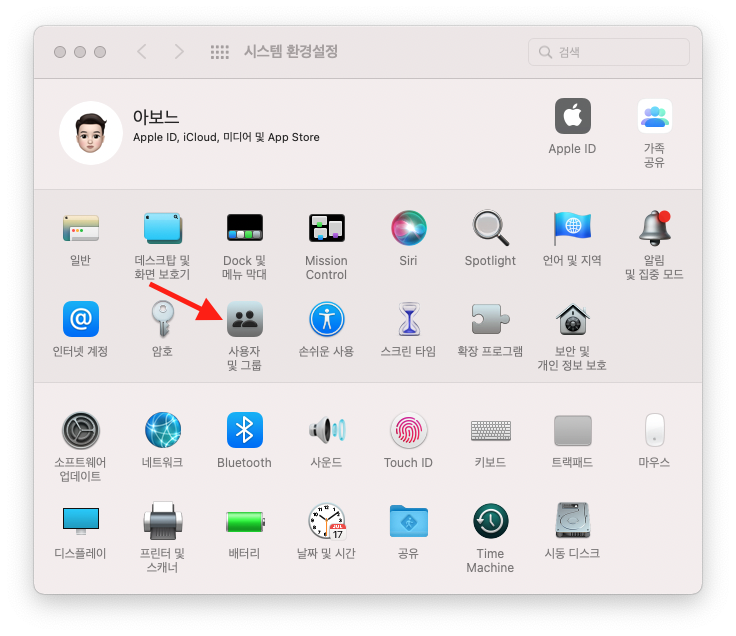 시스템 환경설정 > 사용자 및 그룹 으로 이동