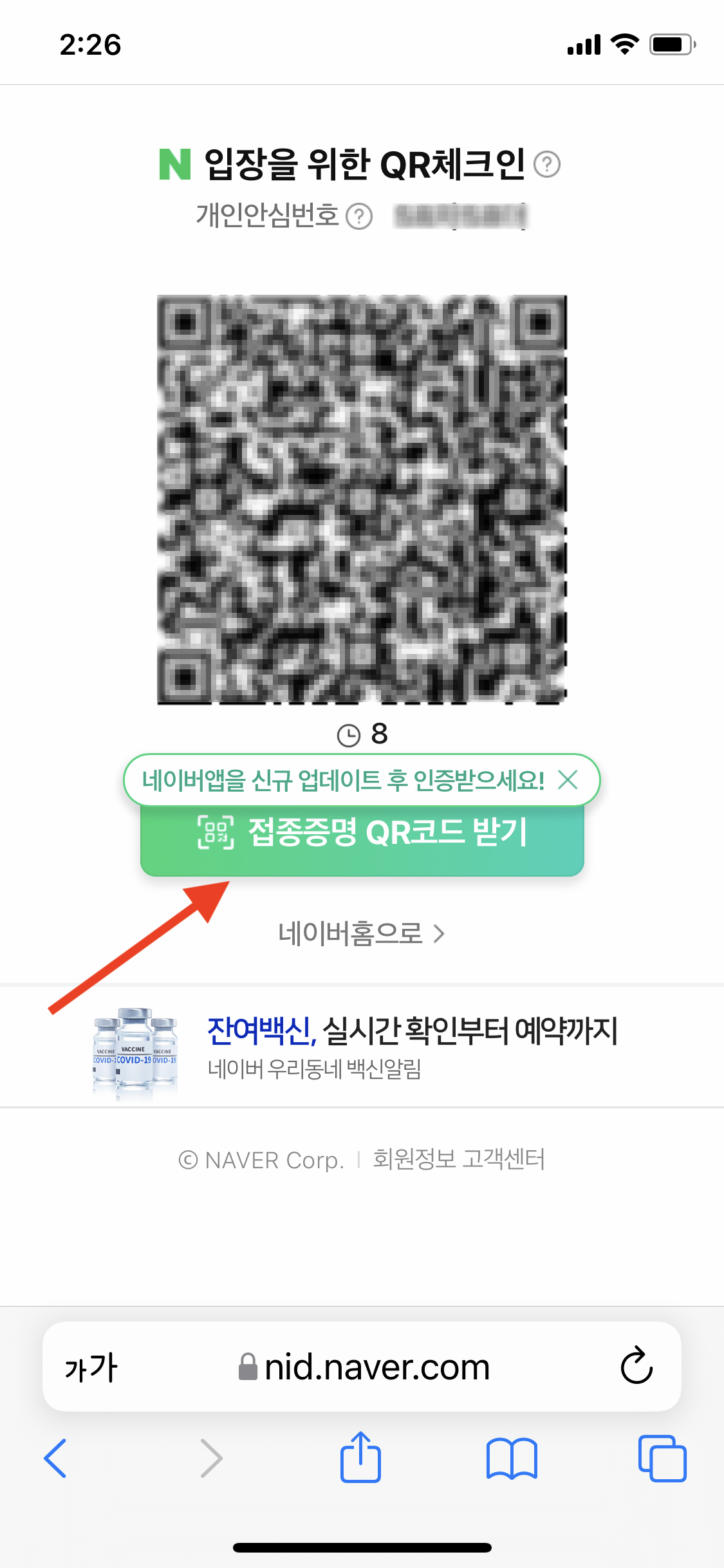 접종증명 QR코드 받기 클릭