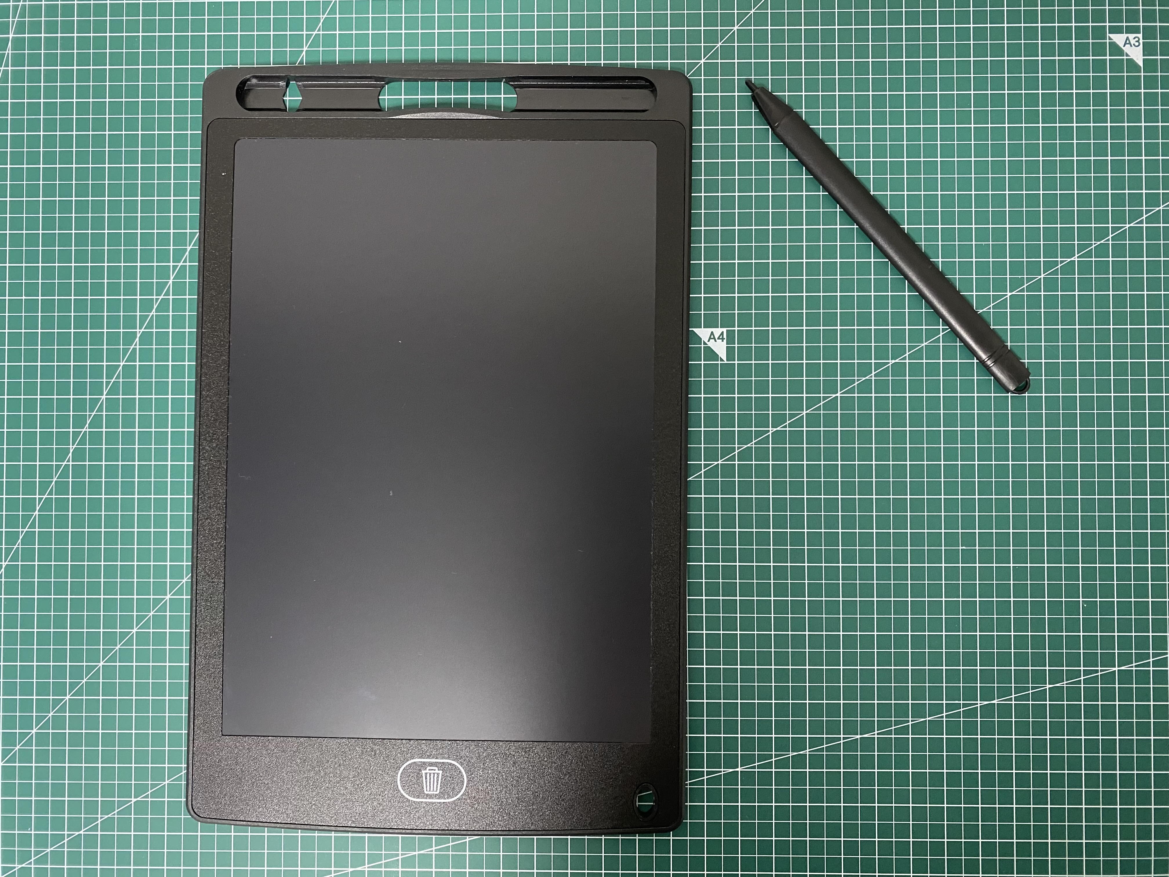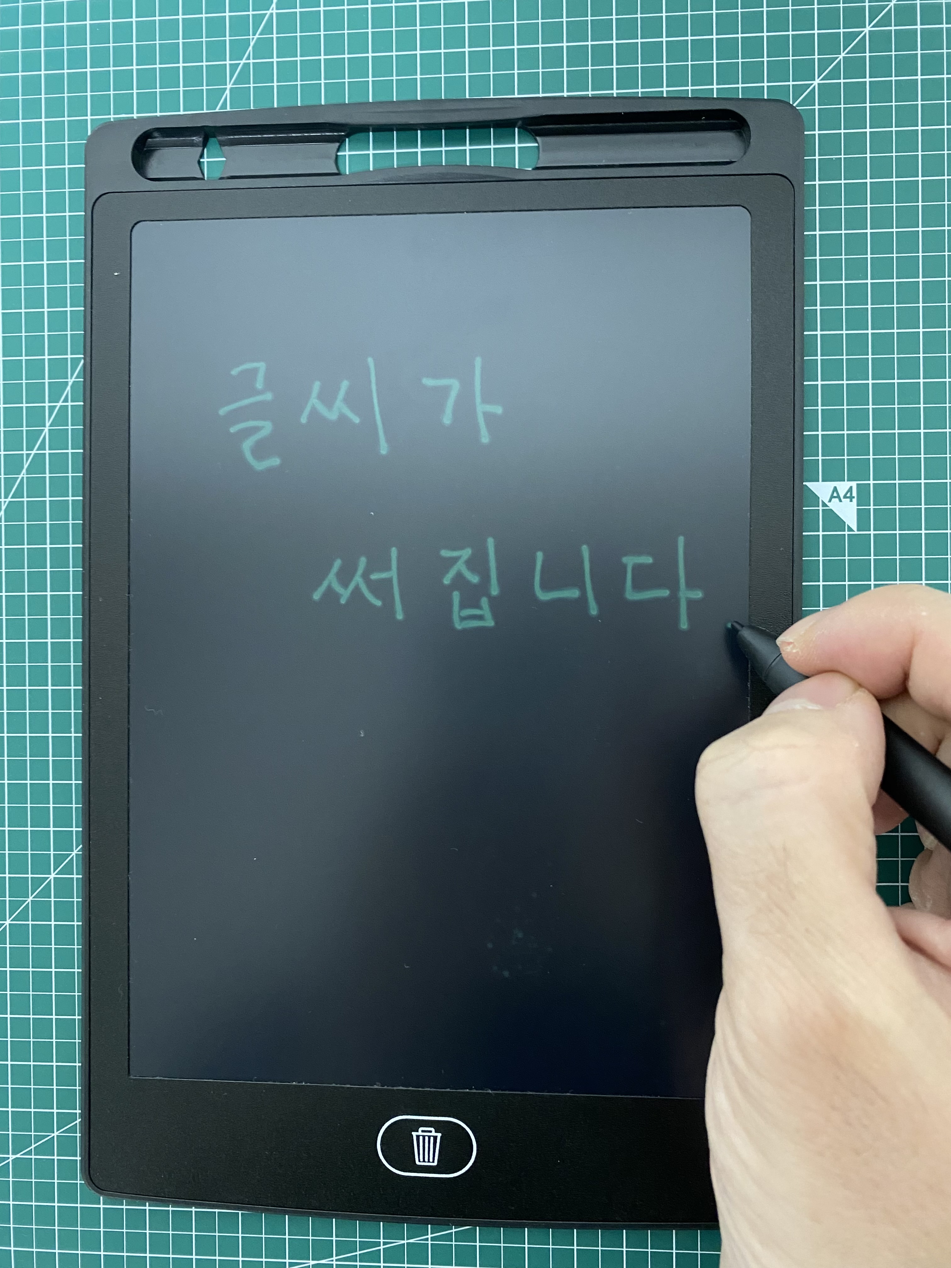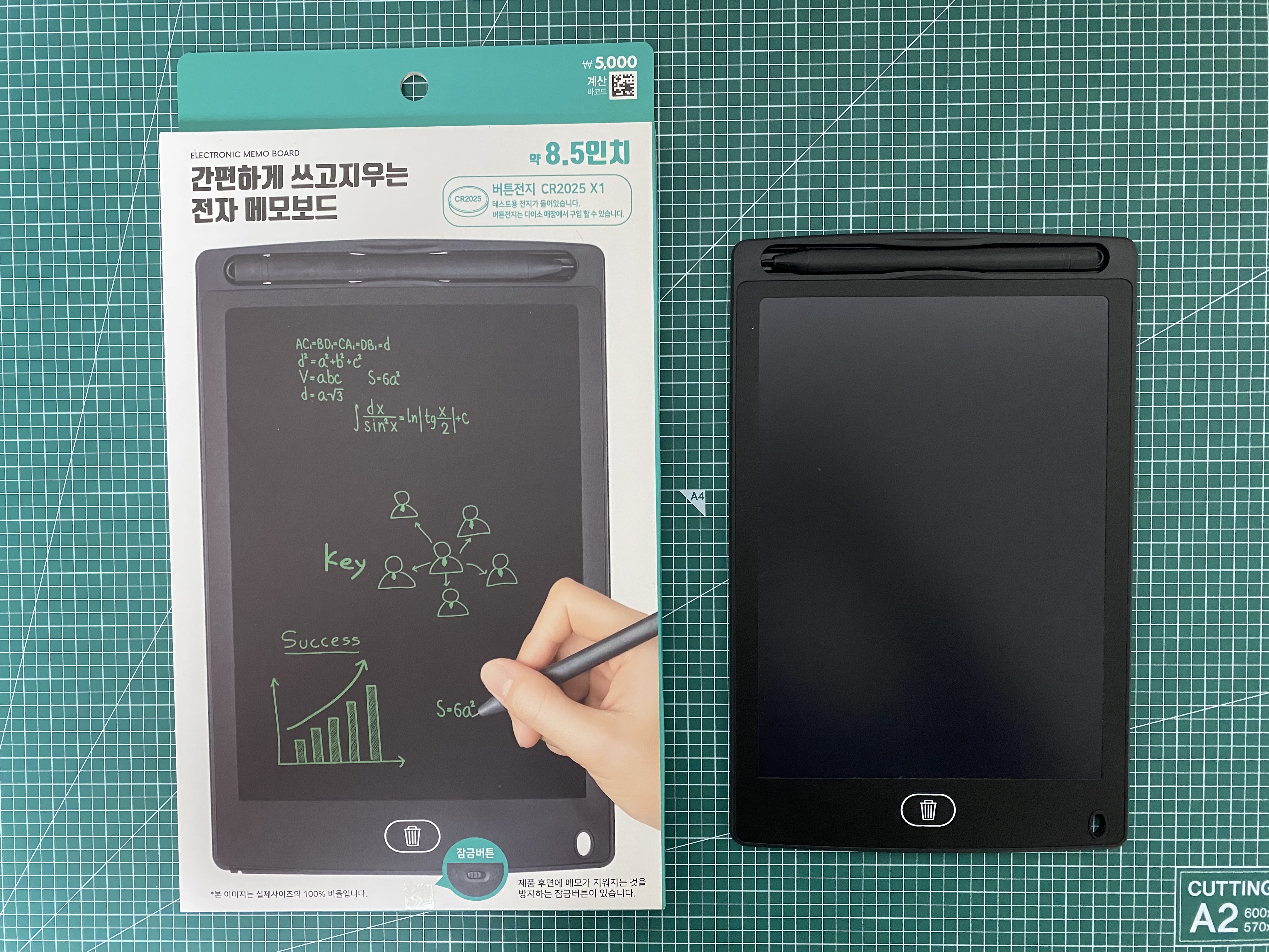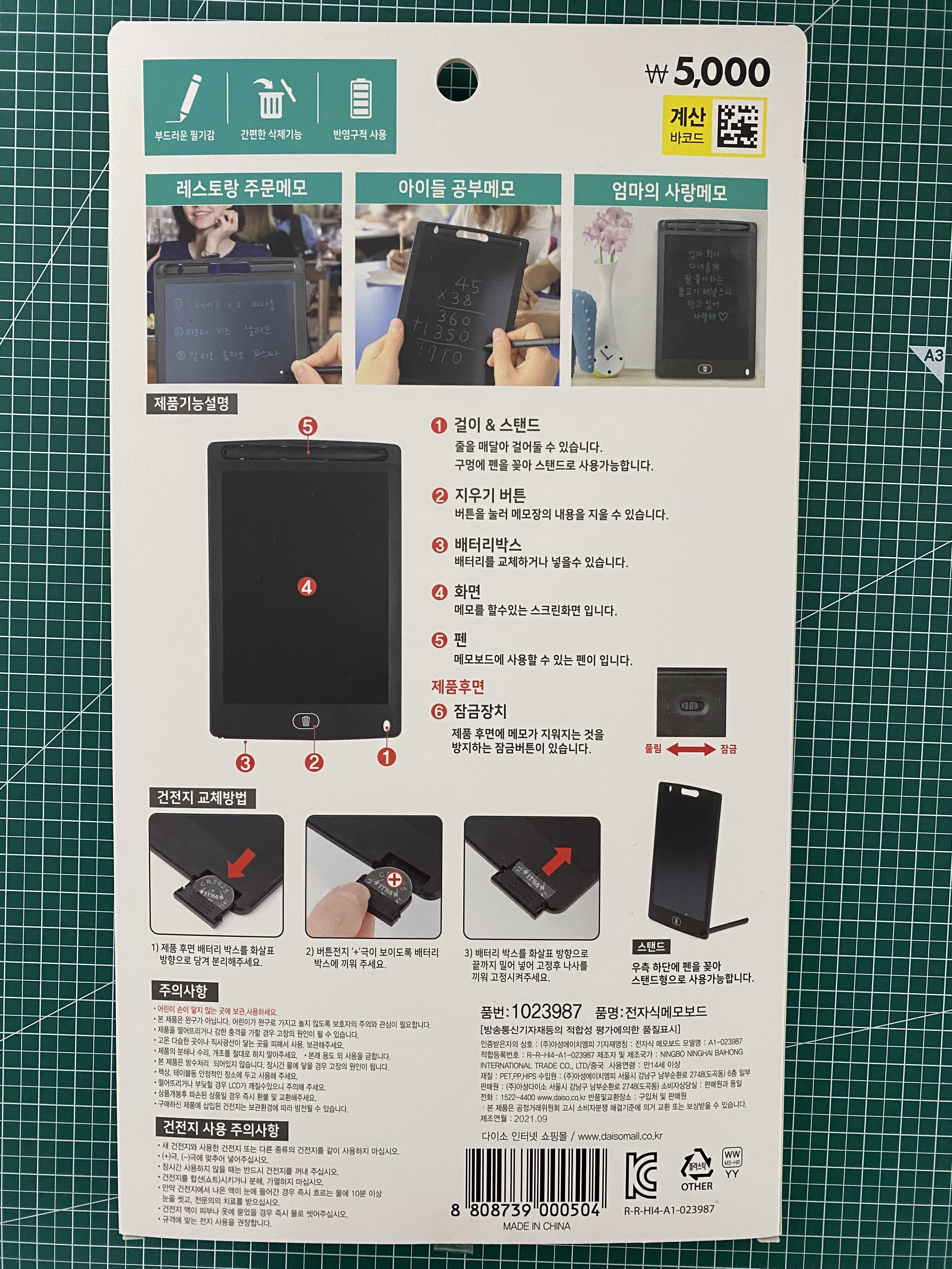 "다이소에서 파는 전자식 메모보드입니다. 버튼전지 CR2025 x 1개가 포함되어 있습니다. 제품 후면에 메모가 지워지는 것을 방지하는 잠금버튼이 있습니다."