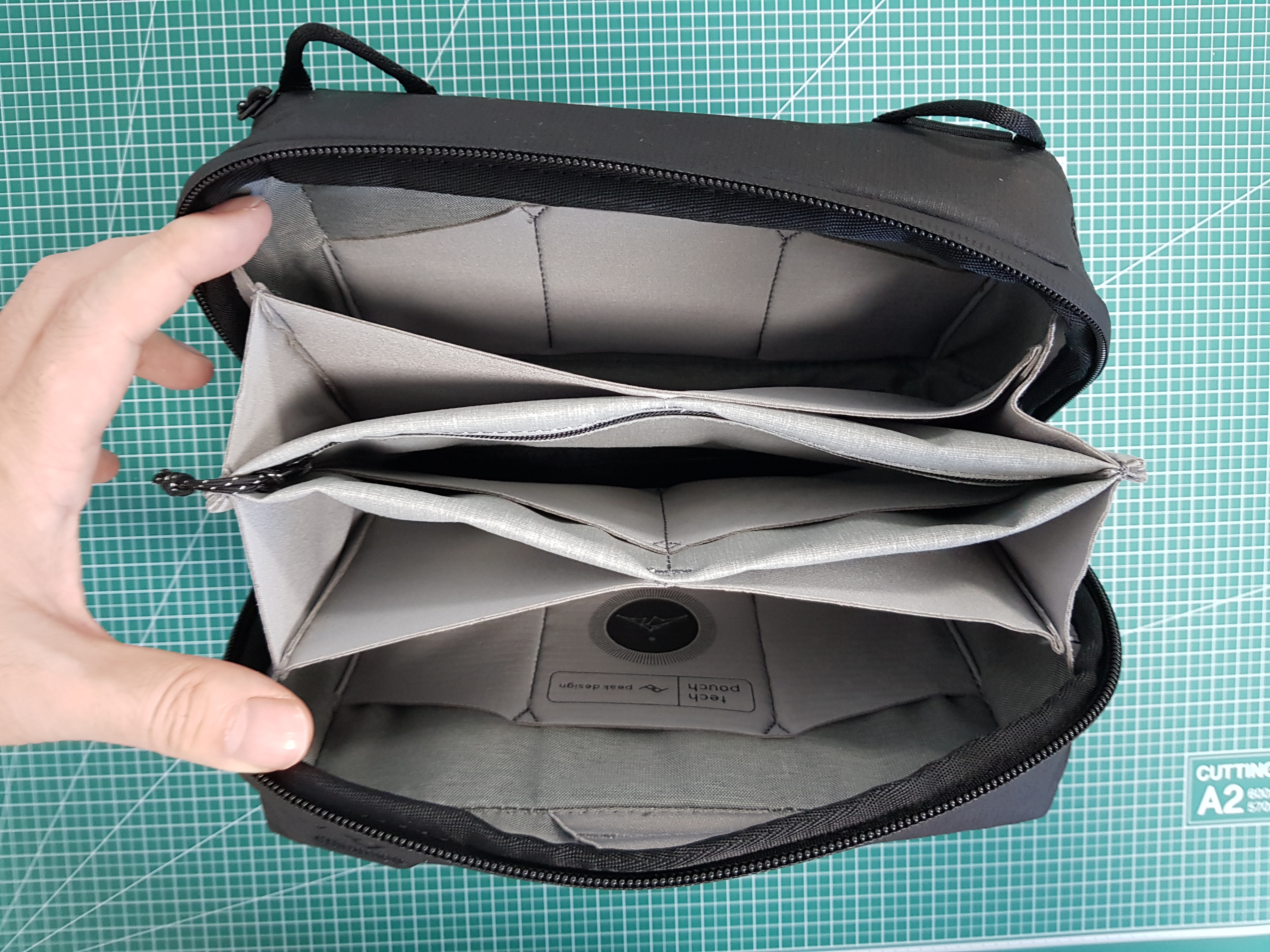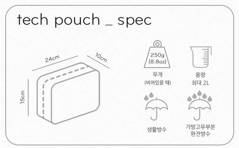 테크 파우치의 외장 원단은 내후성능을 가진 200D 나일론이며 PE(폴리에스터), PC(폴리카보네이드), TPU(폴리우레탄) 소재로 복합 코팅된 나일론 직조로 강력한 생활방수 성능을 갖고 있습니다.
