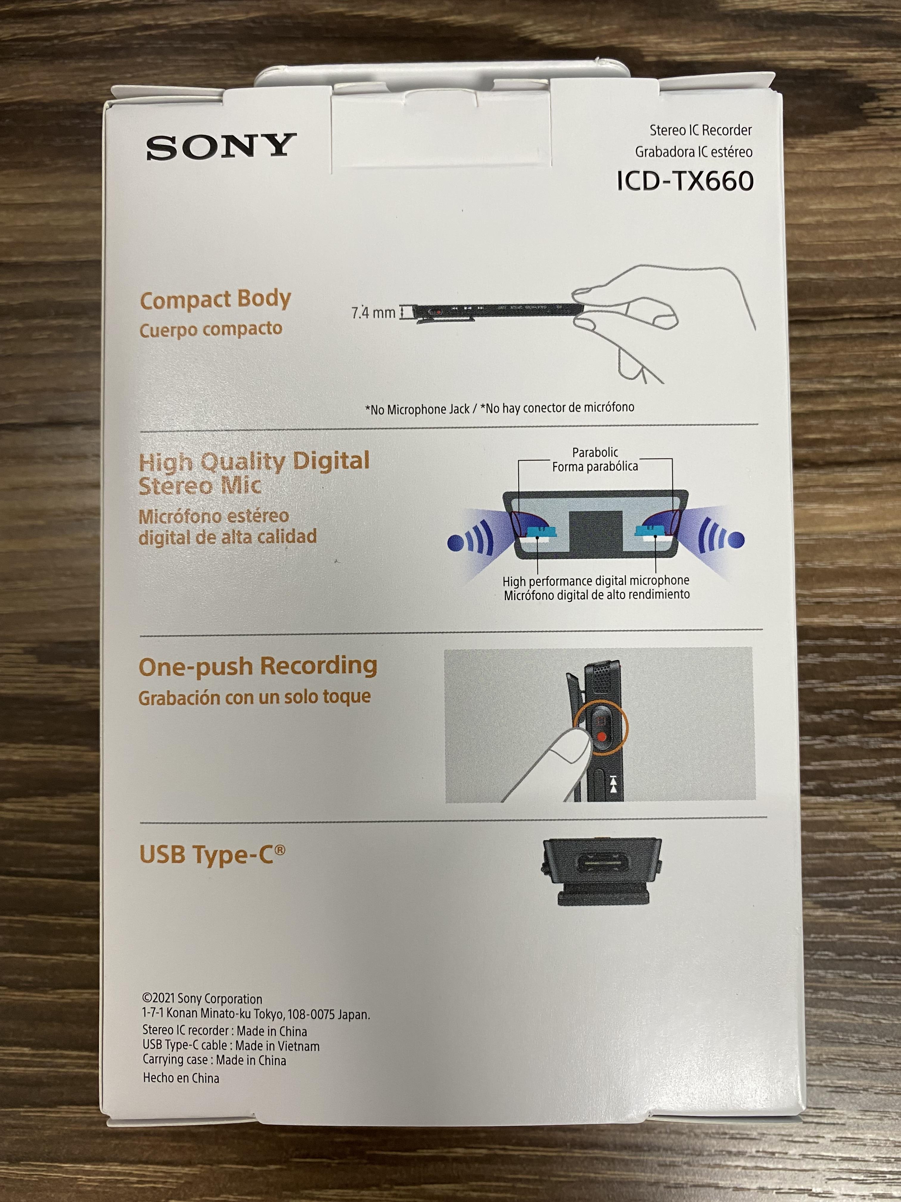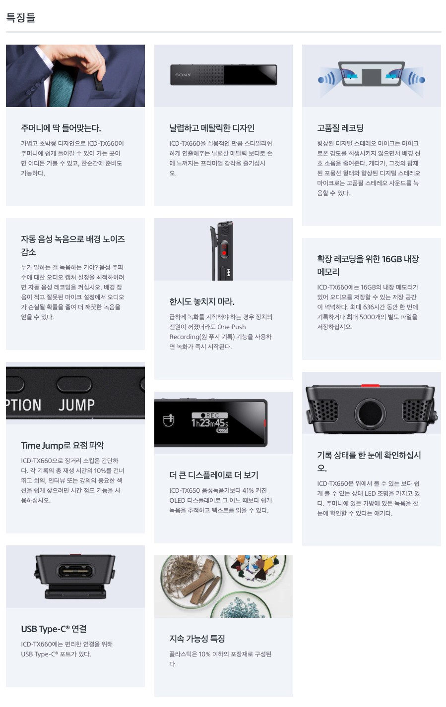 뛰어난 성능과 날렵하고 휴대하기 좋은 사이즈를 결합한 ICD-TX660은 윗주머니에 미끄러져 들어갈 정도로 작다. 또한 타임 점프 재생, 원 푸시 녹음, 자동 음성 녹음과 같은 프리미엄 녹음 품질과 유용한 기능도 제공한다.