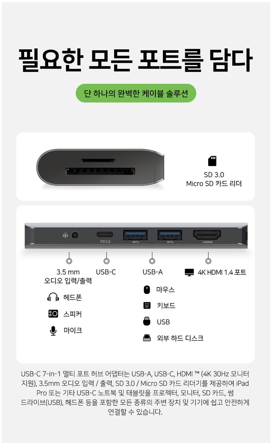 USB-C 7-in-1 멀티 포트 허브 어댑터는 USB-A, USB-C, HDMI (4K 30Hz 모니터 지원), 3.5mm 오디오 입력/출력, SD 3.0/Micro SD 카드 리더기를 제공하여 iPad Pro 또는 기타 USB-C 노트북 및 태블릿을 프로젝터, 모니터, SD 카드, 썸드라이브(USB), 헤드폰 등을 포함한 모든 종류의 주변 장치 및 기기에 쉽고 안전하게 연결할 수 있습니다.