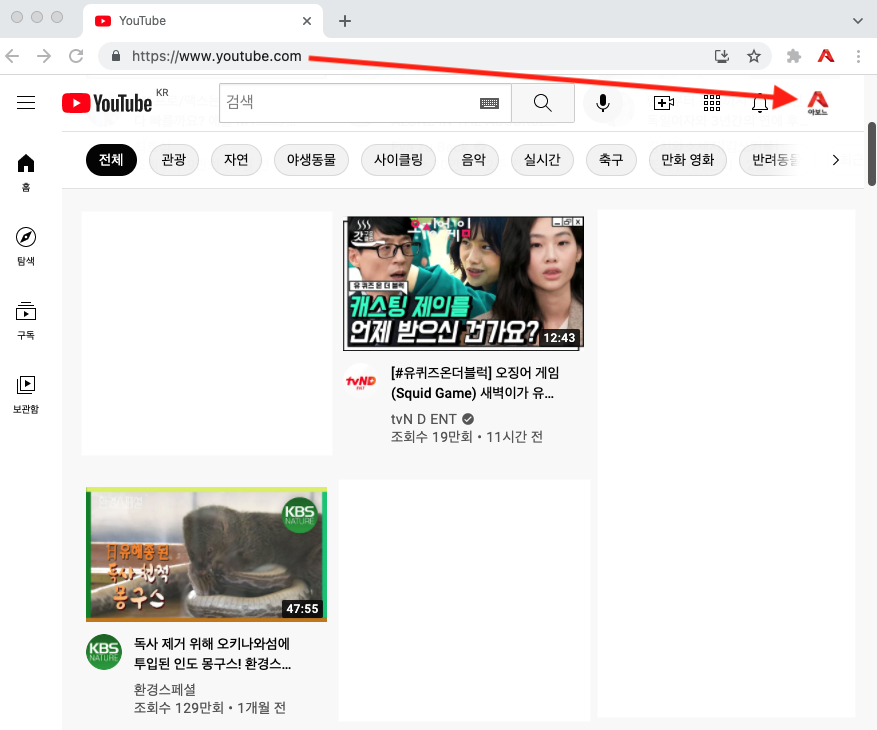 유튜브에 로그인 한 상태 > 자신의 계정 아이콘 클릭