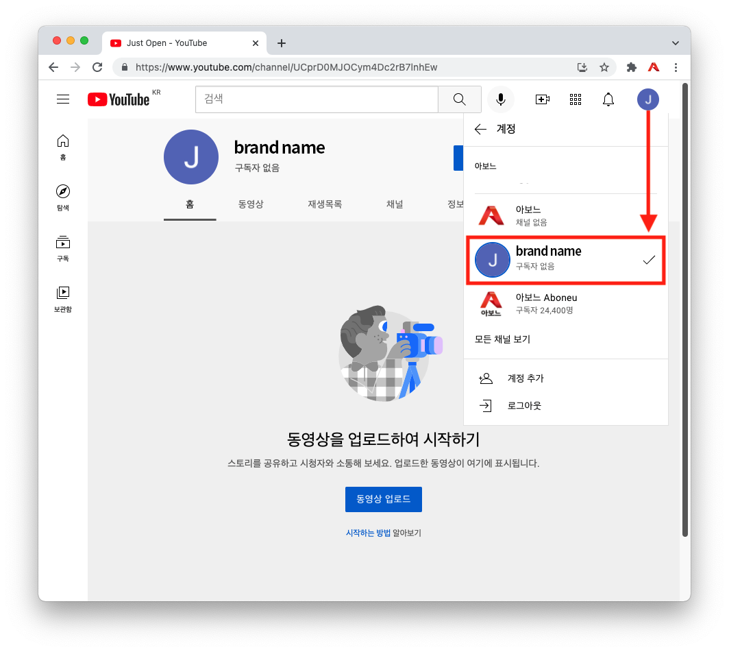유튜브 우측 상단에 자신의 계정 아이콘을 클릭해서 여러 브랜드 채널 중에서 선택해서 사용 가능합니다.