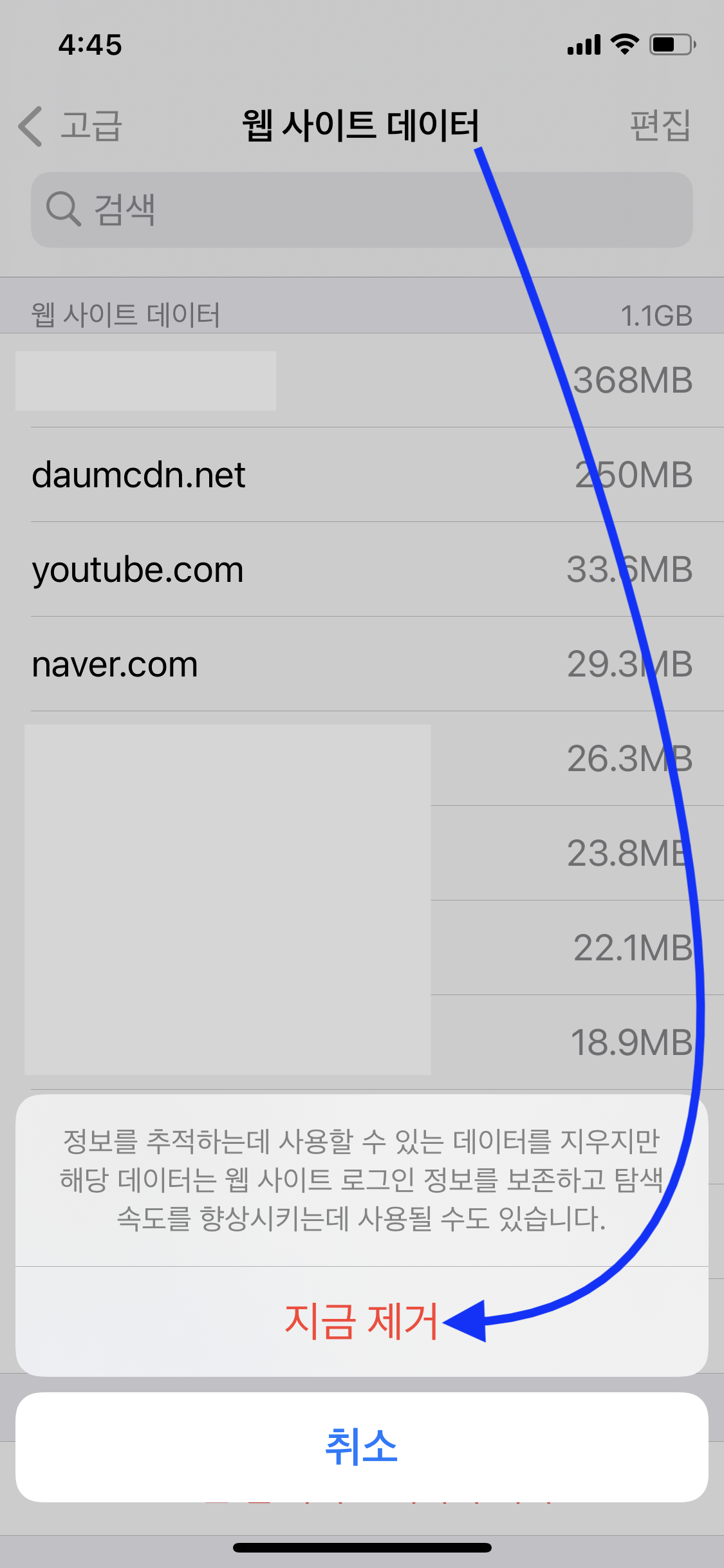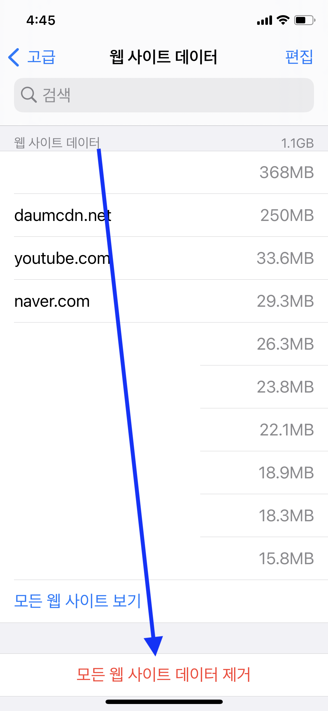아래에 '모든 웹 사이트 데이터 제거' 클릭