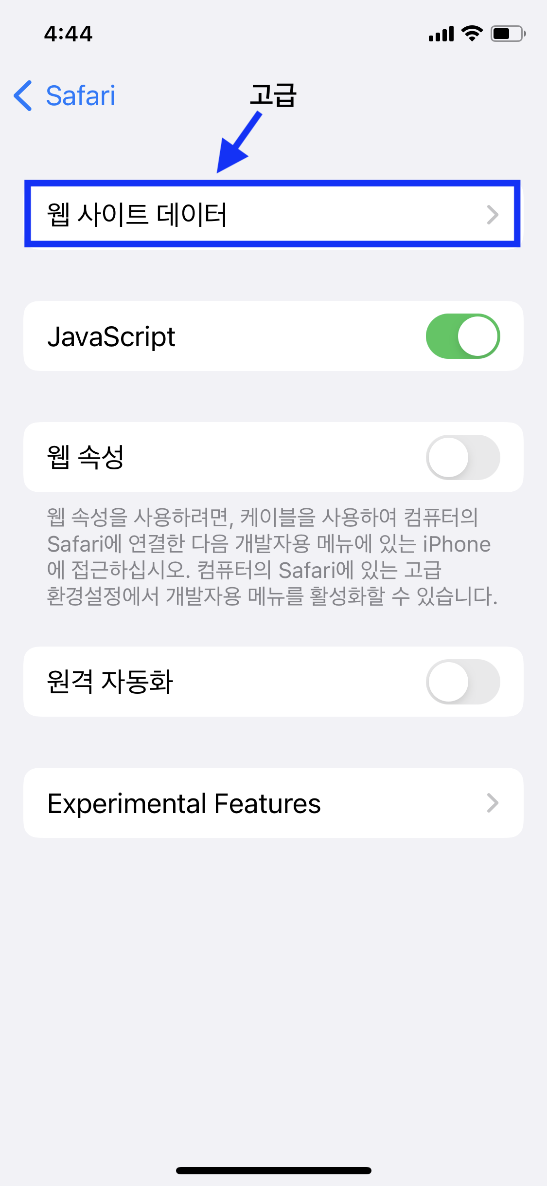 설정 > Safari > '고급' 클릭