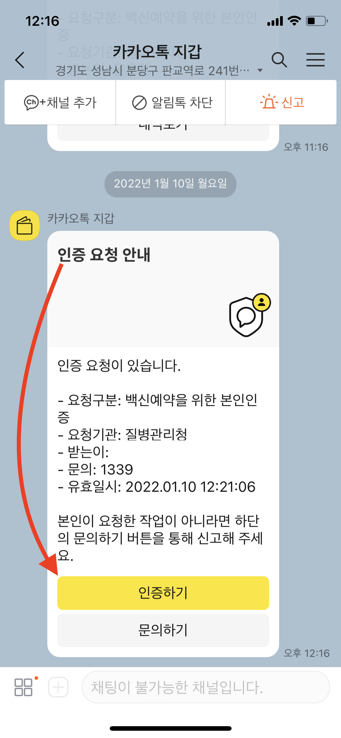 카카오톡에서 '인증하기' 클릭합니다.