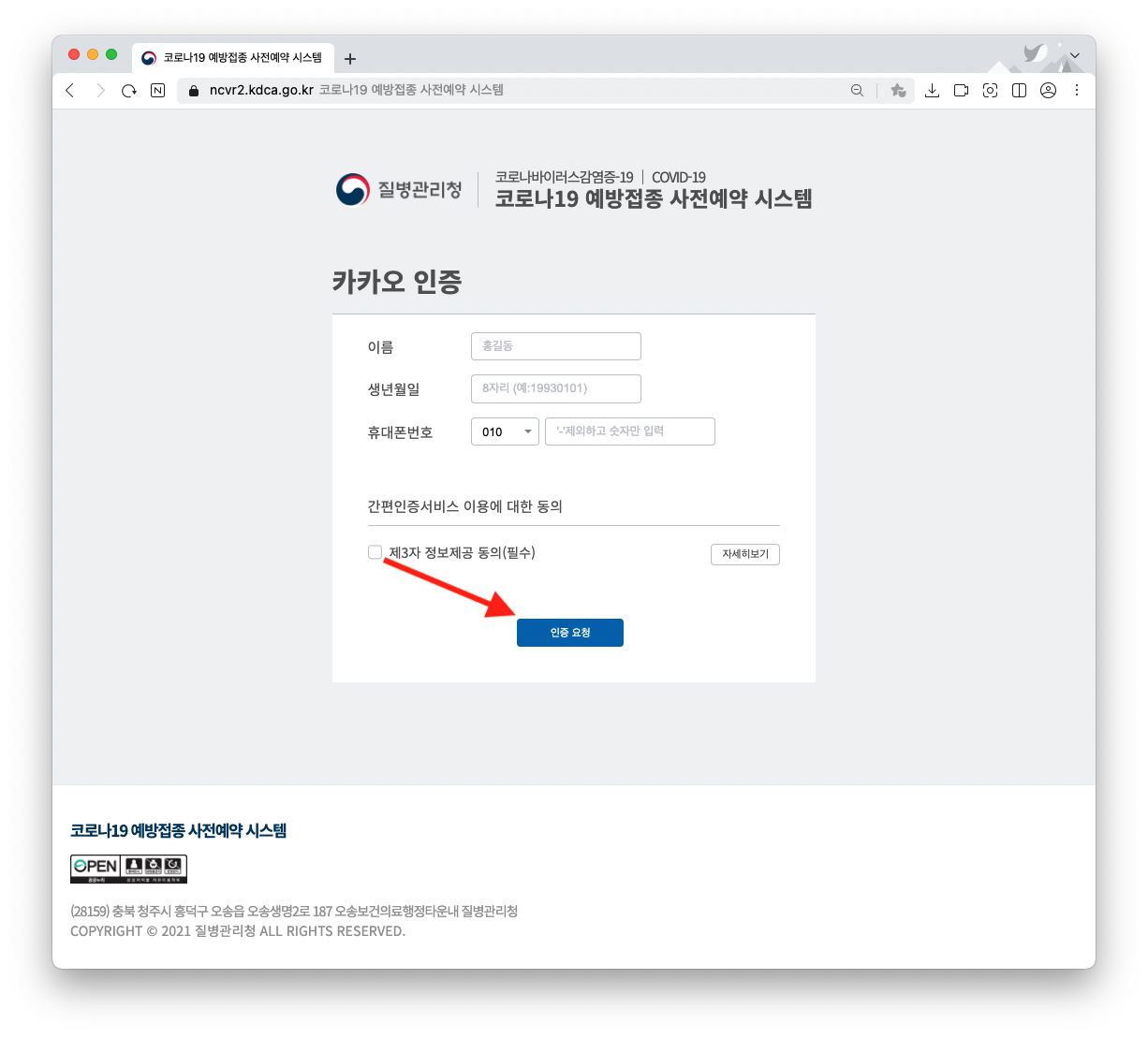 카카오 인증 정보를 입력 > 인증 요청 클릭