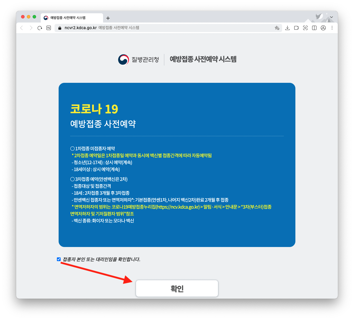위 질병관리청 예방접종 사전예약 시스템 사이트로 접속 > 본인 체크 후 확인
