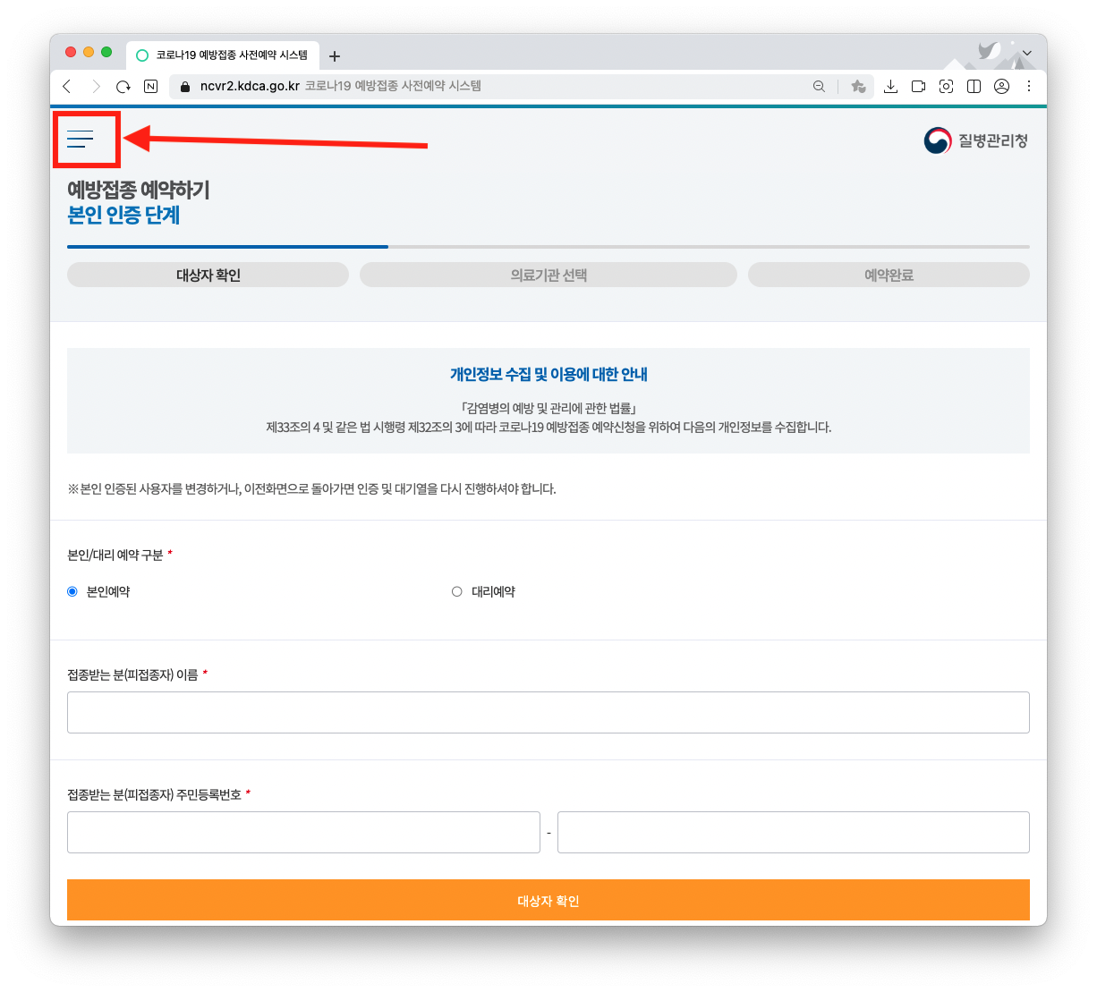 예방접종 예약하기 페이지에서 왼쪽 상단에 '선3개 라인' 아이콘을 클릭합니다.