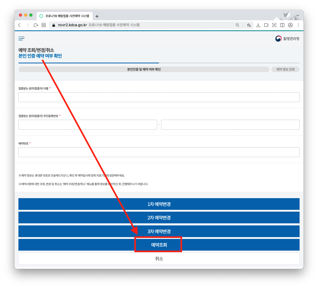 개인 정보 입력 후 > 예약조회 클릭