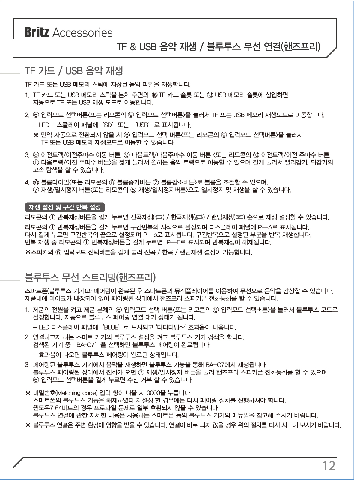 TF & USB 음악 재생, 블루투스 무선 연결(핸즈프리) - 12p
