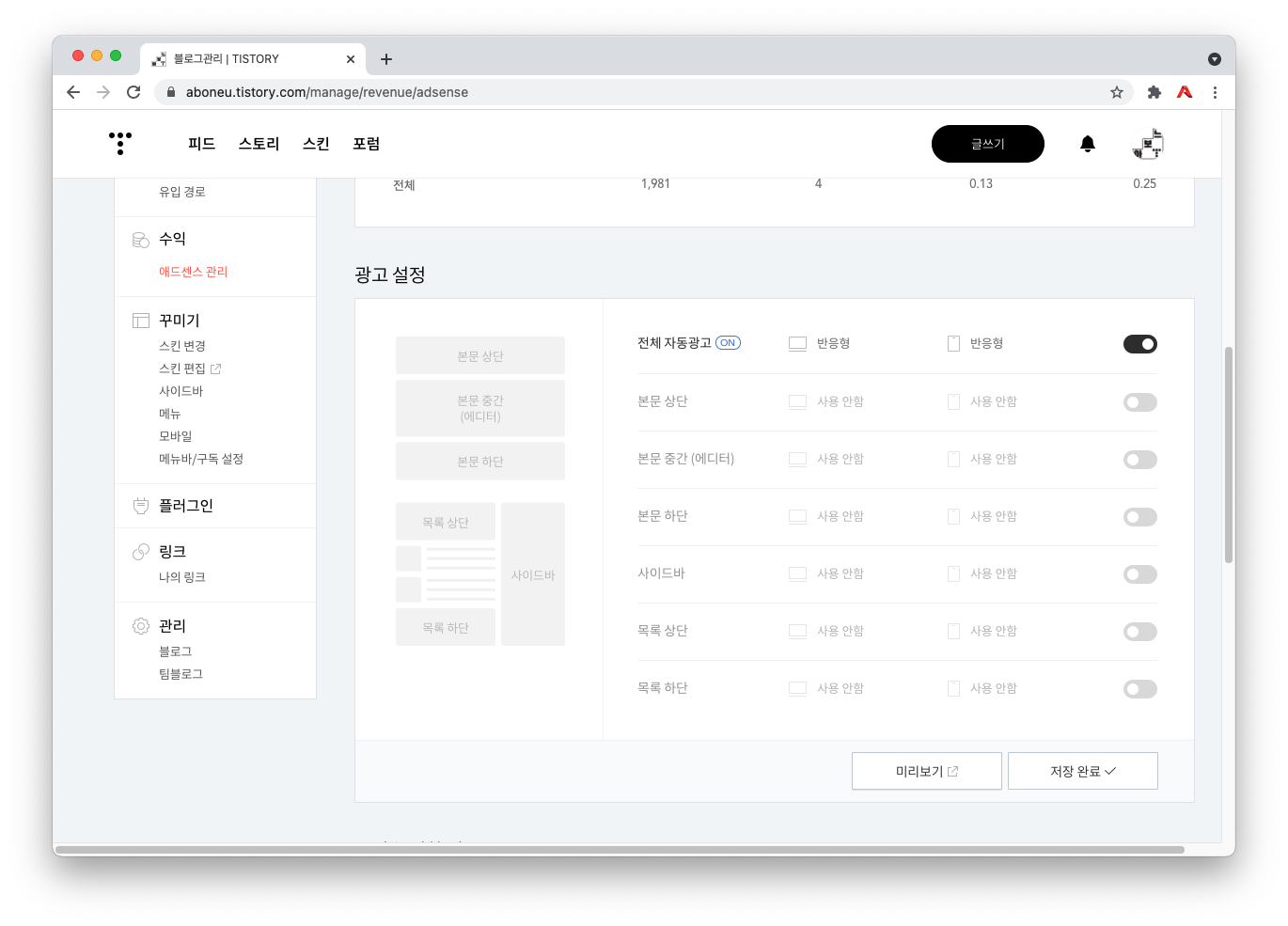 이제, 티스토리 화면 내에서 애드센스 광고 설정 노출 위치를 정해줍니다.