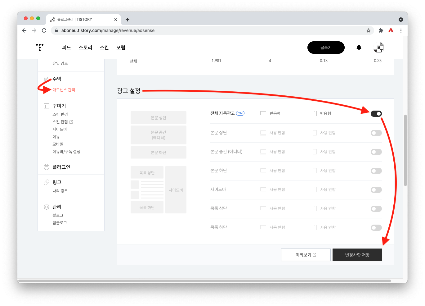 편하게 '전체 자동광고' 체크 후 > 변경사항 저장 클릭해도 됩니다.