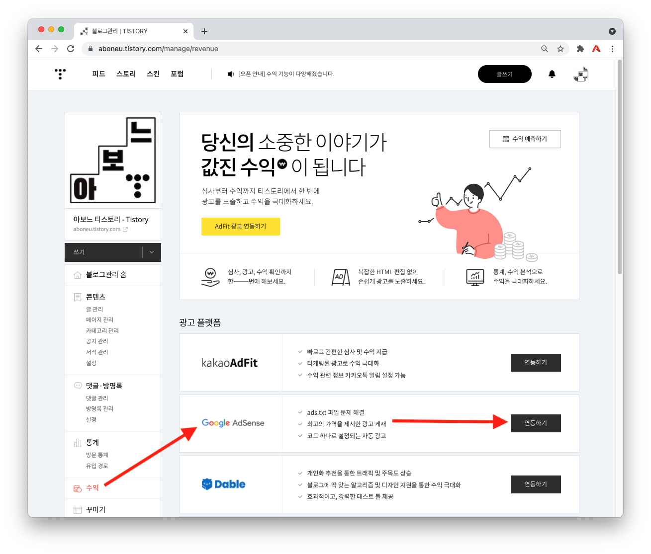 "이젠, 티스토리 관리자 홈에서 바로 애드센스를 연동해서 티스토리 관리자 페이지에서 수익 통계를 확인하고 광고 위치를 설정할 수 있습니다."